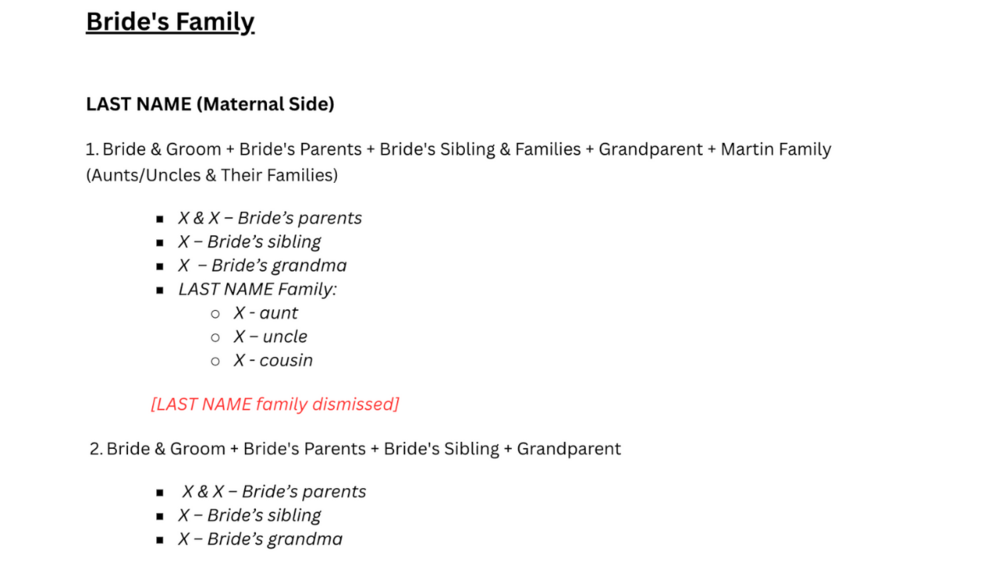 Following best practices, the list starts with larger group shots and works down to smaller, more intimate setups—because it’s easier to take people out than to bring them in! With a clear and organized format, you’ll avoid last-minute confusion and ensure your photographer has a solid game plan for the big day.